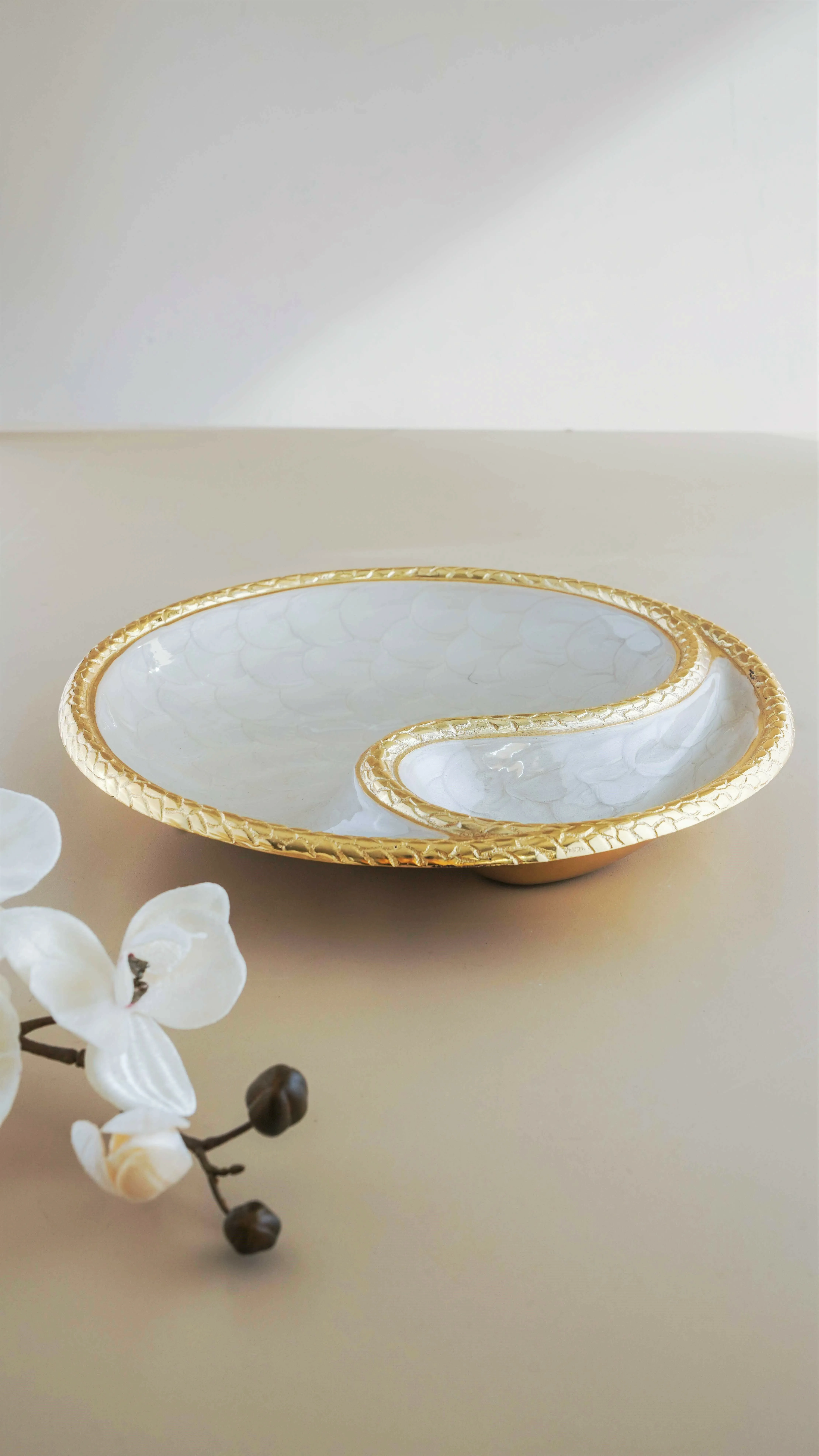 قدم ضيافتك بأسلوب فريد وفاخر باستخدام أجمل أطباق التقديم المودرن والمميزة. طبق تقديم أوليان - حجم كبير , لون أبيض وذهبي يشكل إضافة مميزة لمجموعة التقديم الخاصة بك بفضل تصميمه ذو الطابع الملكي الفخم. كما أنه مصنوع يدويا من الستيل العالي الجودة على يد الحرفيين المهرة.