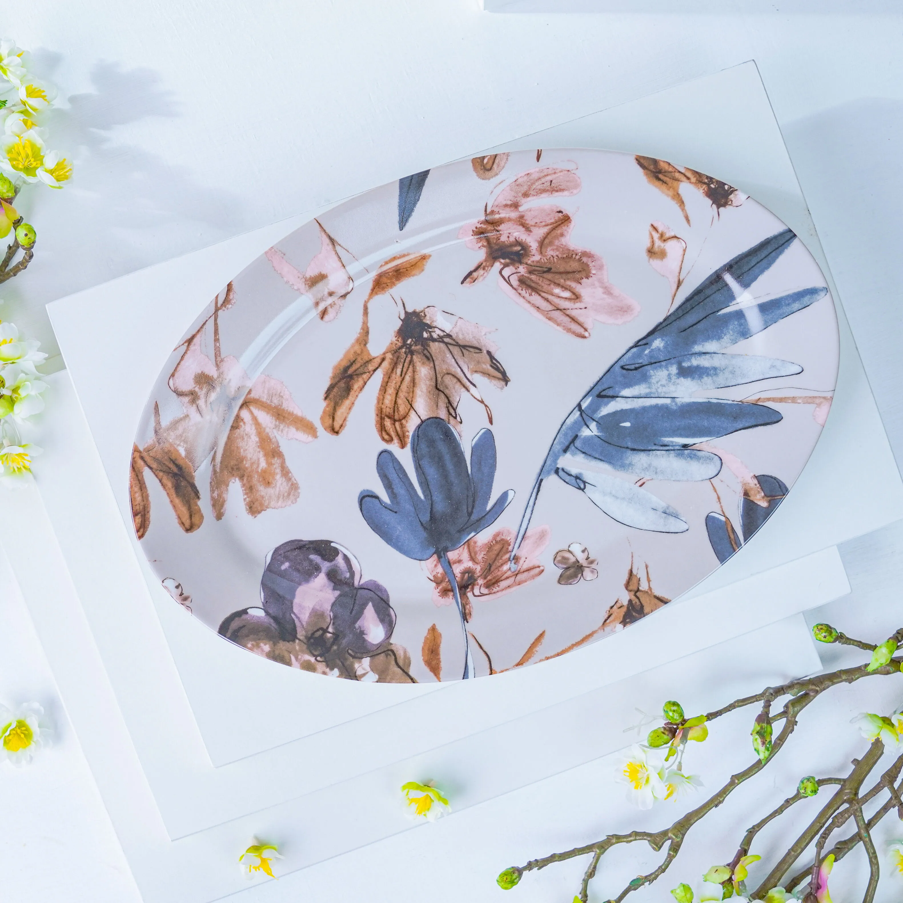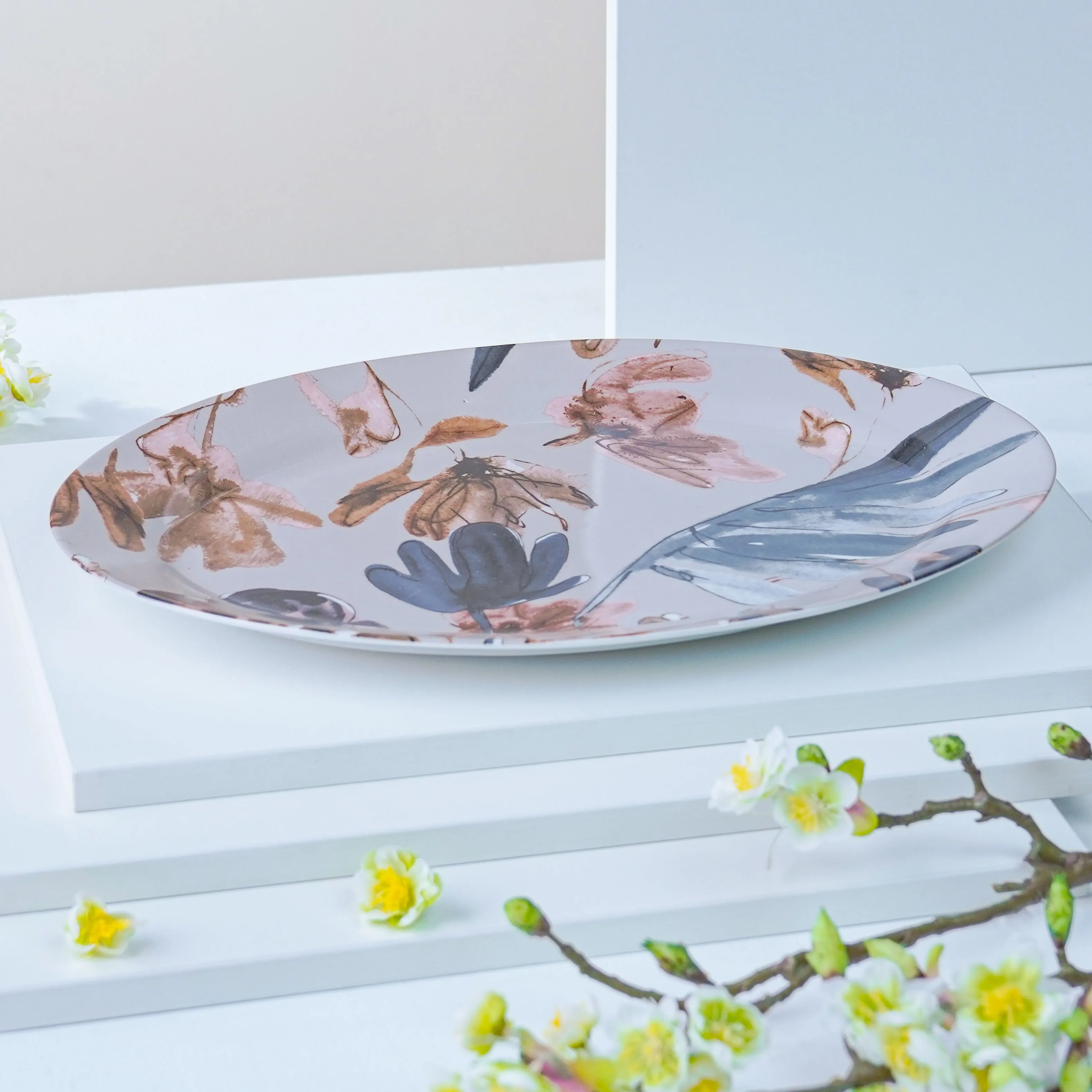 طبق تقديم بتصميم مميز يجمع بين روح الطبيعة والالوان الهادئة وفخامة الحواف الذهبية. يشكل الطبق إضافة مميزة لمجموعة أدوات التقديم الخاصة بك فهو متين ومقاوم وطويل الأمد. يزيد أناقة أي طاولة ضيافة وتقديم وسيعجب كل الضيوف بفضل تصميمه الجذاب والزخارف النباتية التي يحملها بالألوان الهادئة والجذابة.